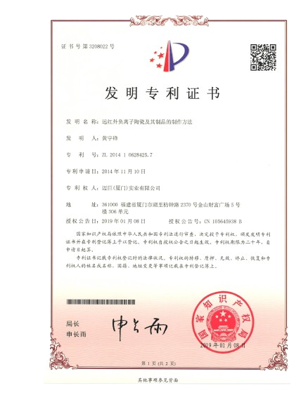 At MagiChina, we are committed to blending traditional craftsmanship with modern innovation.We are proud to be granted the Invention Patent for “Manufacturing Method of Far-Infrared Negative Ion Ceramics and Their Products” (Patent No. ZL 2014 1 0628425.7) by the National Intellectual Property Administration of China.